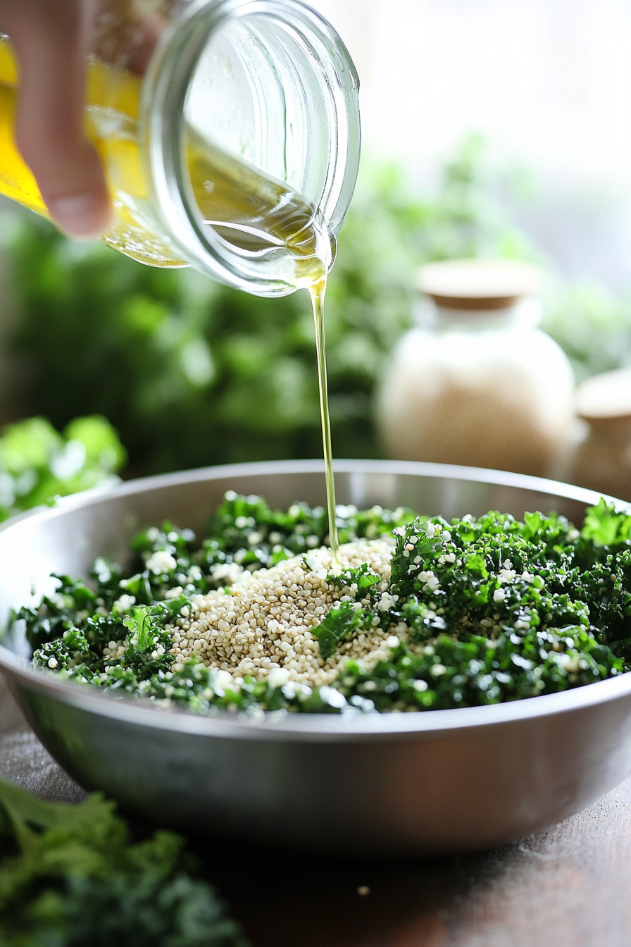 - Stir in kale and 1 Tbsp. olive oil to the quinoa, cover, and keep warm.