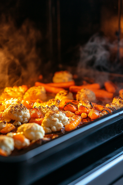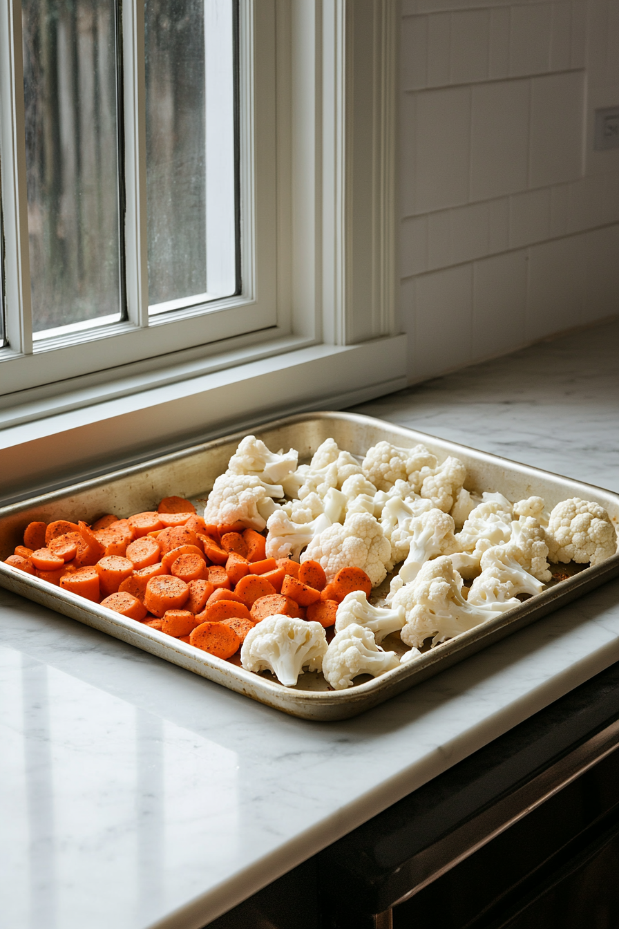 - Preheat the oven to 425ºF and toss cauliflower florets and carrots with olive oil, smoked paprika, garlic powder, cumin, salt, and pepper on a baking sheet.