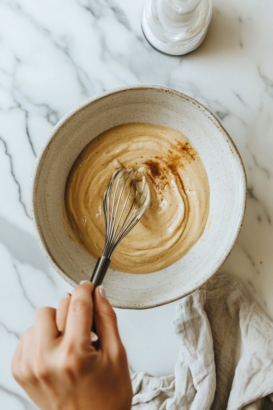 - For the dressing, whisk tahini, vinegar, maple syrup, chili garlic sauce, curry powder, turmeric, and salt in a bowl. Gradually add water until smooth and at the desired consistency.