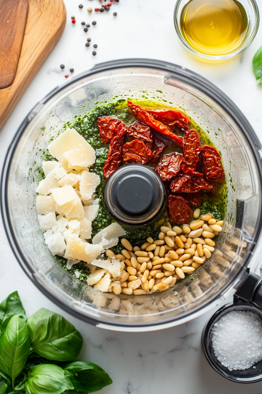 - Make the Pesto: Blend sun-dried tomatoes, basil, Parmesan, pine nuts, garlic, salt, and pepper in a food processor. Drizzle in olive oil until smooth.
