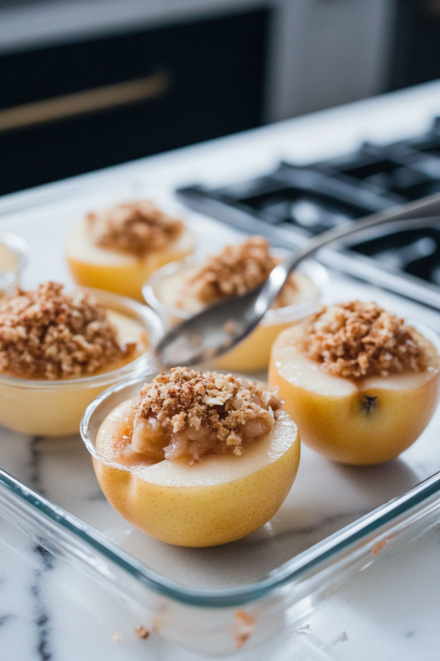 This recipe is for baked apples filled with a buttery brown sugar oat crumble. To add more flavor, you can use warm apple cider instead of water.