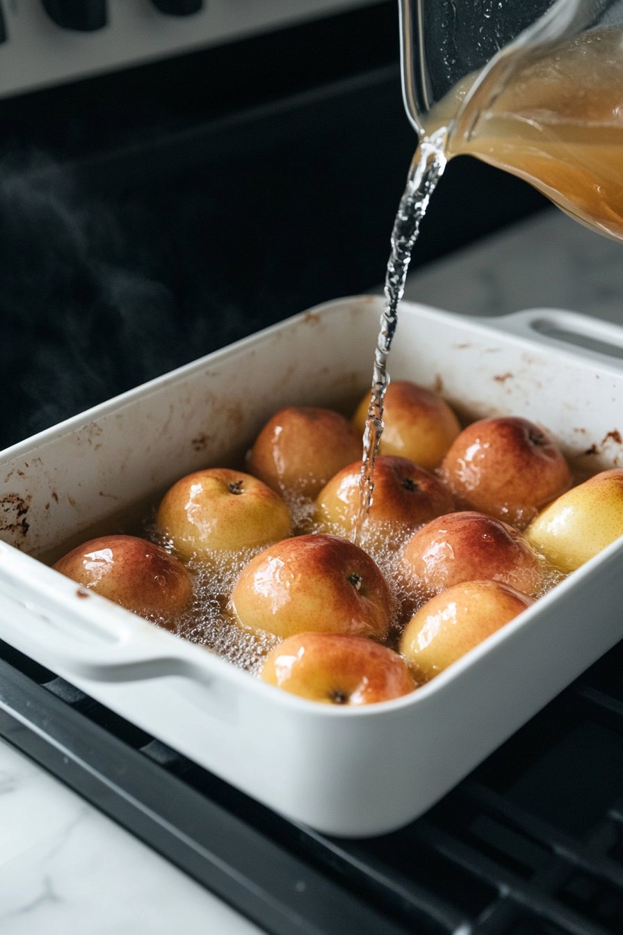 Adding water to the baking dish to keep Classic Baked Apples moist