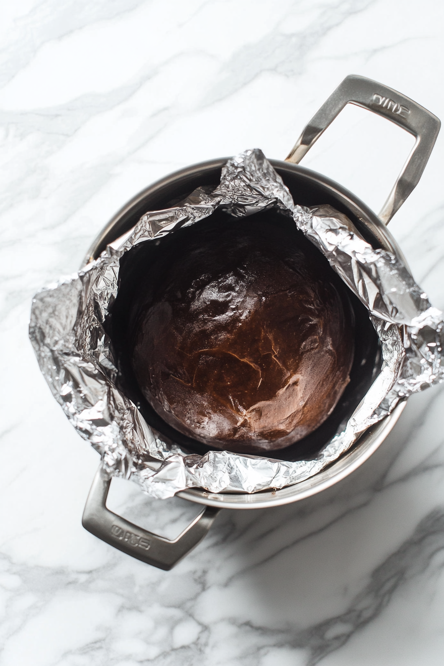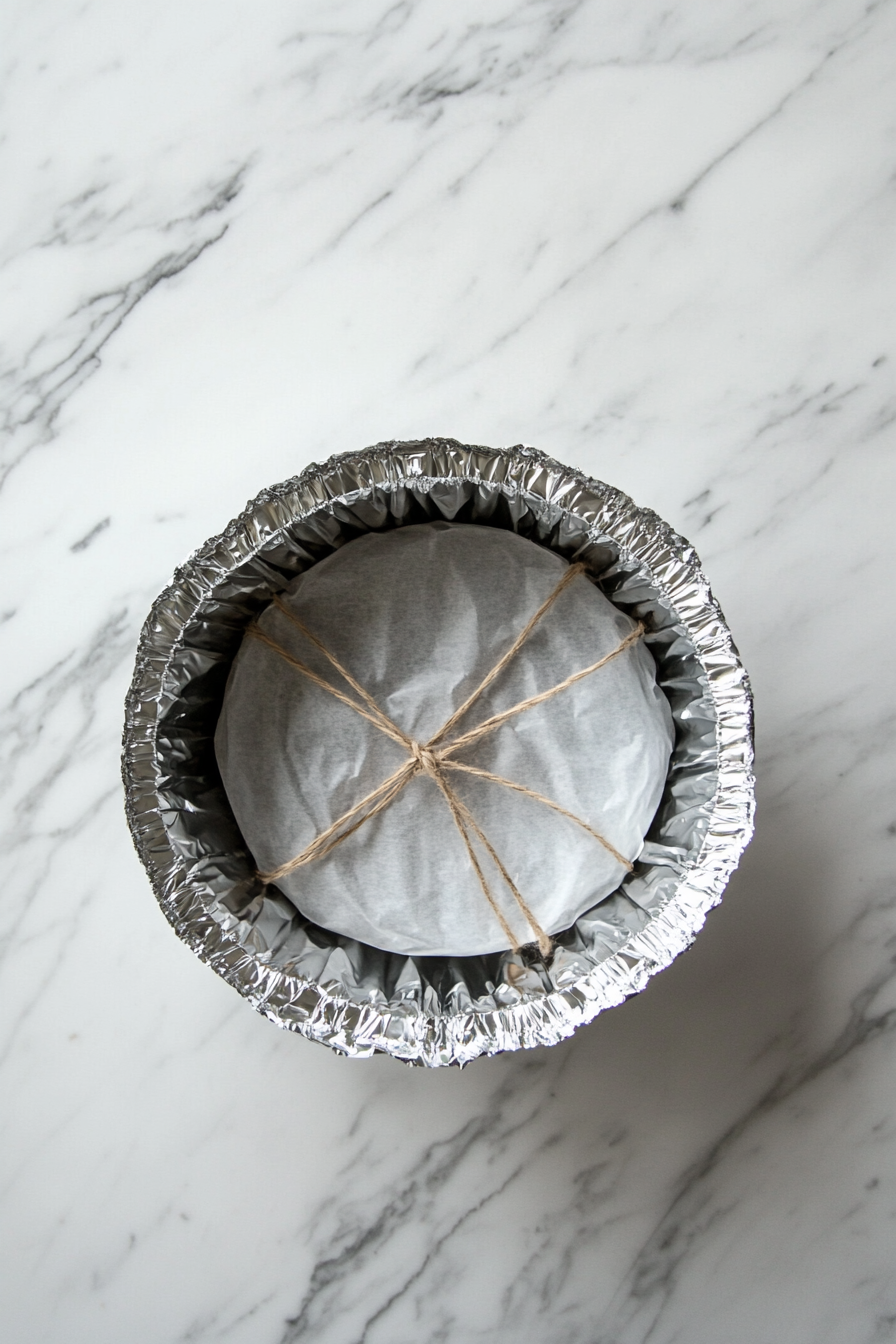 - Cover the pudding: Place a sheet of foil over a sheet of parchment paper, pleat the center, and wrap over the basin.