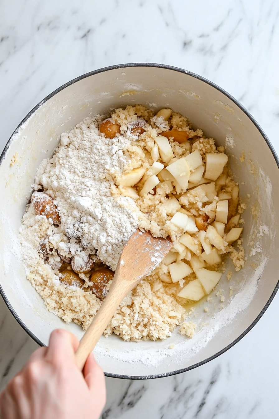 - In a large bowl, combine soaked fruits (with any leftover liquid), suet, flour, sugar, salt, spices, mixed peel, breadcrumbs, grated apple, and eggs until well-mixed.