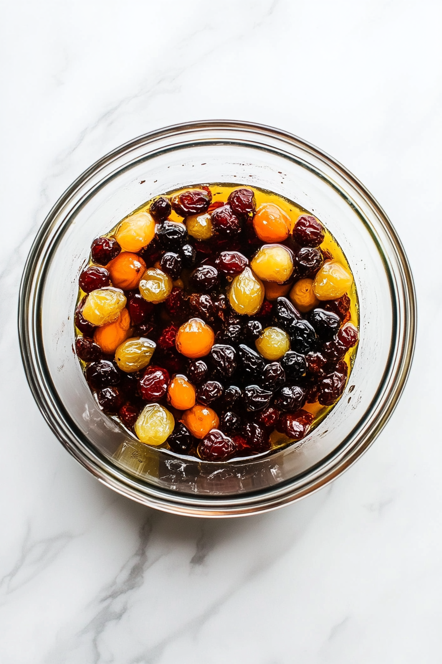 - Soak currants, raisins, and sultanas in brandy, lemon, and orange juice overnight.