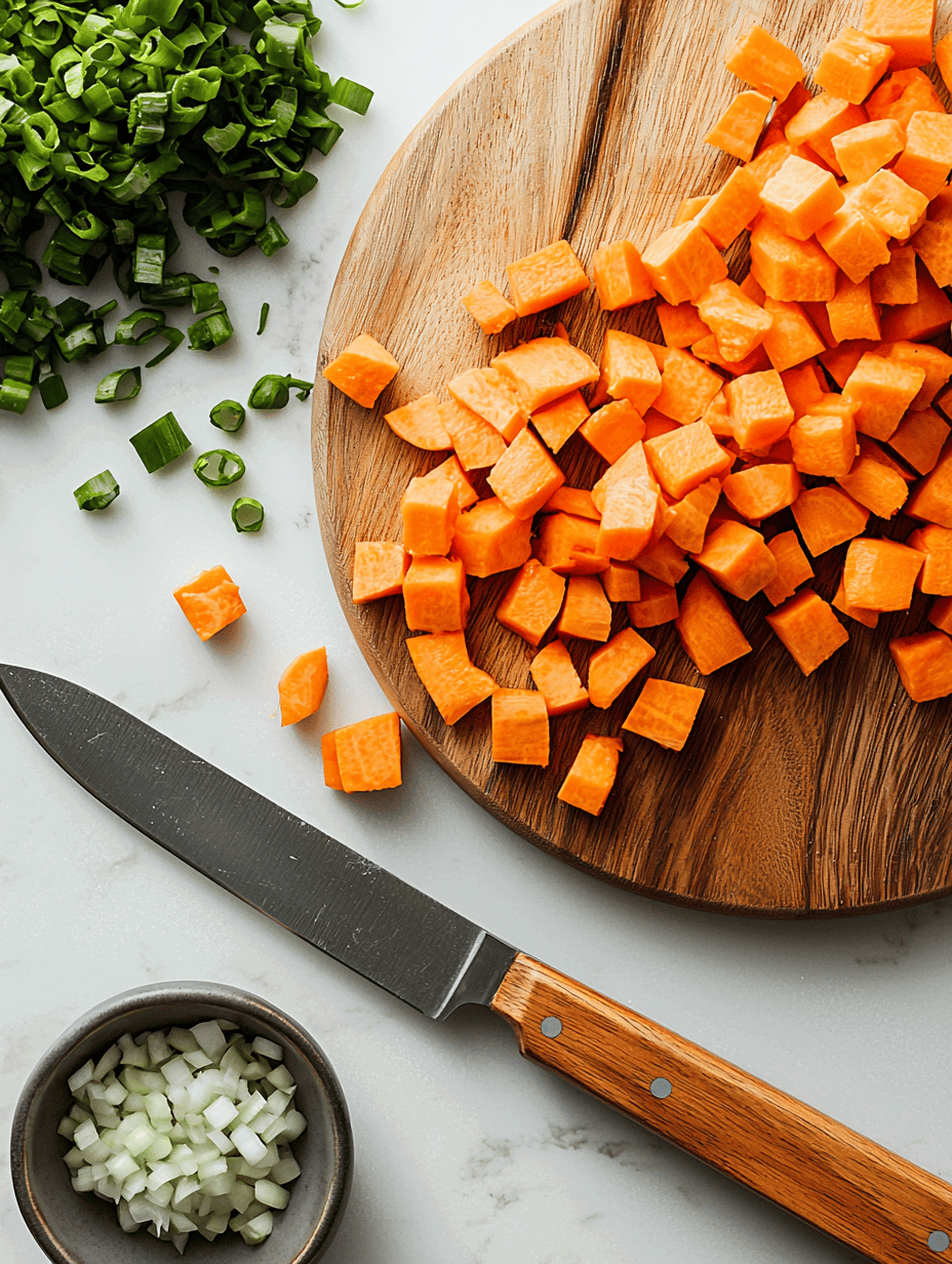 - Begin by peeling the sweet potatoes and carrots, then chopping them into uniform pieces to ensure even cooking. Dice the onion finely—that's your flavor base.