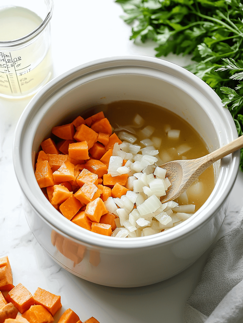 - Transfer the sautéed onions to the Crockpot. Add the chopped sweet potatoes and carrots next, then pour in the vegetable broth. Stir everything together so the ingredients are evenly coated.