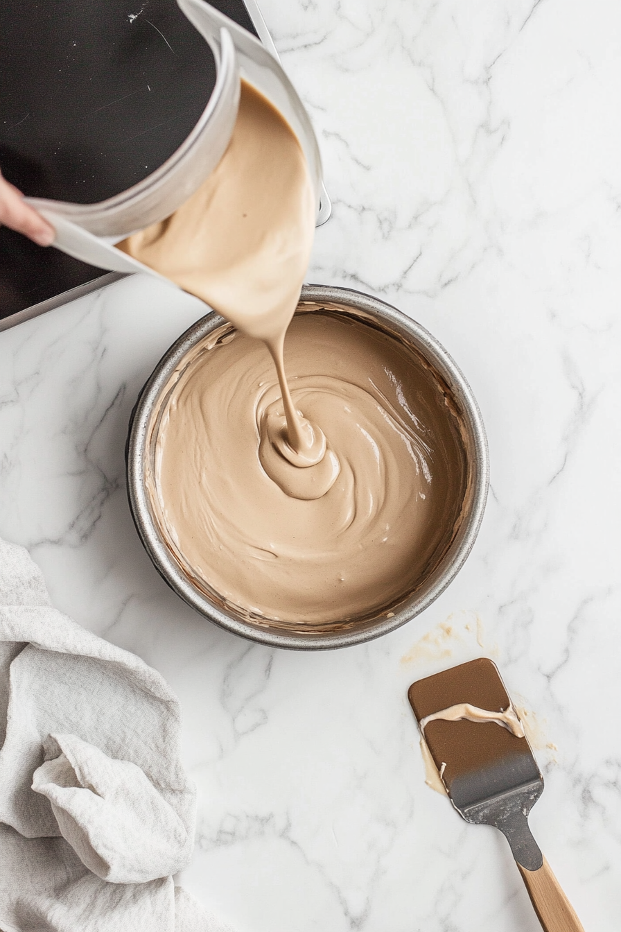 This image shows the light and airy cotton candy-flavored cake batter being carefully poured into a greased rectangular pan, ready for baking.