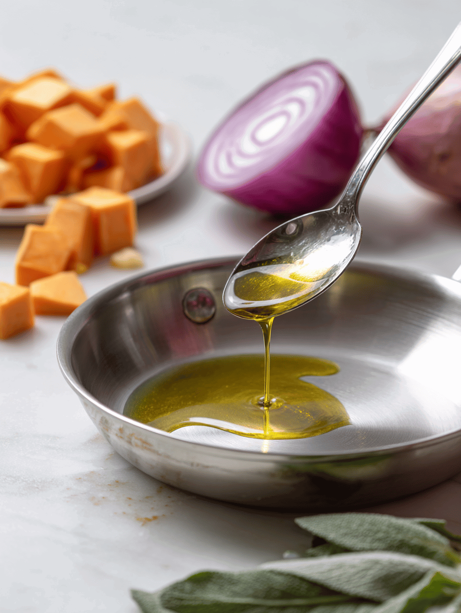 • Preheat your oven to 190°C (375°F). Lightly grease your skillet with a tablespoon of olive oil to prevent sticking and set it aside.