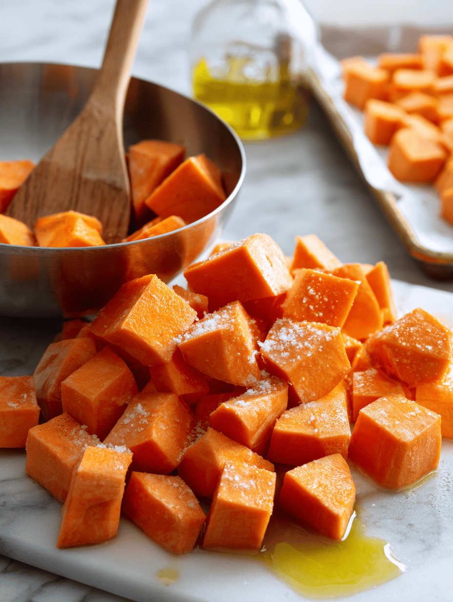 • Peel and cube the sweet potato into bite-sized pieces. Toss them with a tablespoon of olive oil and a pinch of salt, then spread them on a baking sheet. Roast in the oven for about 20-25 minutes, until they’re tender and caramelized around the edges, filling your kitchen with a sweet, smoky aroma.
