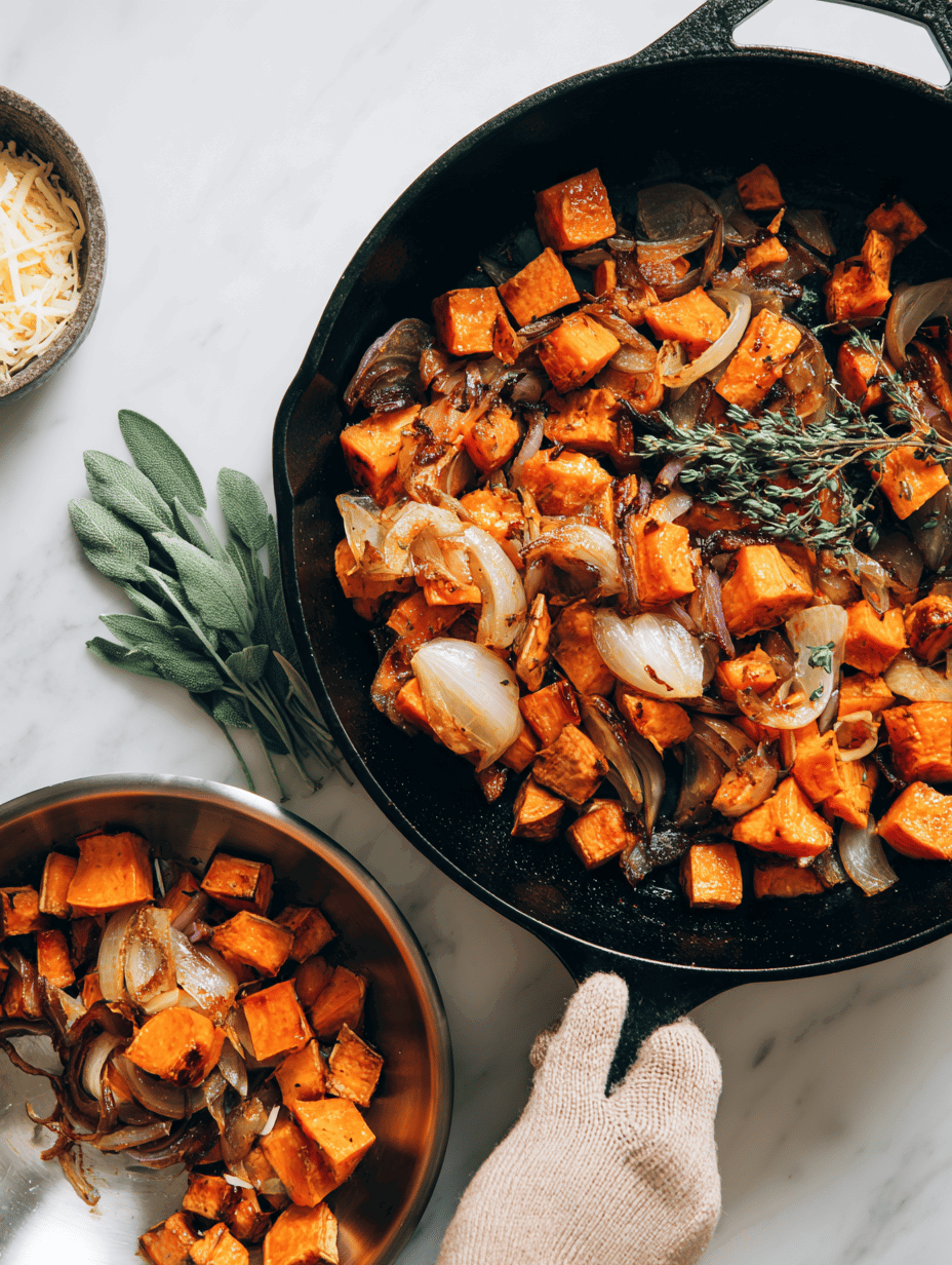• Once the sweet potatoes are roasted and the onions are deeply caramelized, add both to the skillet. Gently stir to combine, spreading everything into an even layer.