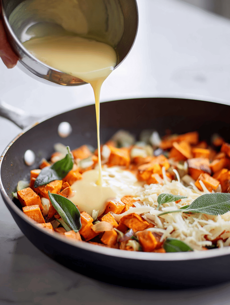 5. Once the onions and sweet potatoes are ready, add them to the skillet. Mix gently to combine. Spread evenly.