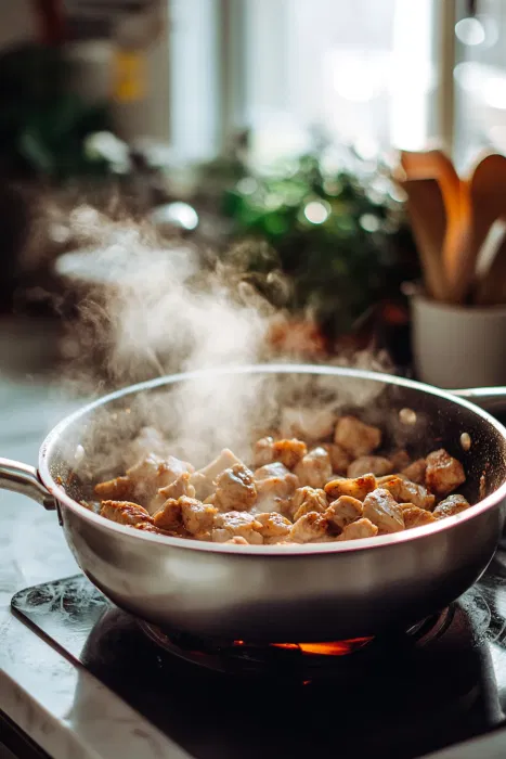 - Add Garlic and ChickenStir in the garlic and chicken, cooking until the chicken turns white around the edges.