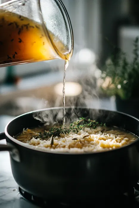 - Add the Broth and RicePour in the chicken broth and stir in the rice, thyme, bay leaf, salt, and pepper.