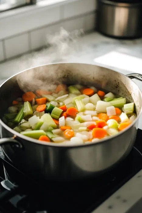 The vegetables start to soften, the broth warms up, and the kitchen takes on that cozy steam that feels like a small reset after a long day.