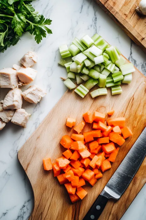 - Get Everything ChoppedChop the onion, carrots, celery, and chicken into bite-sized pieces so the soup cooks evenly.