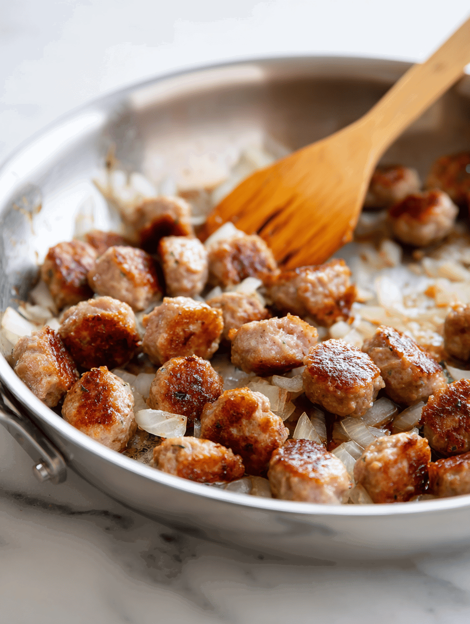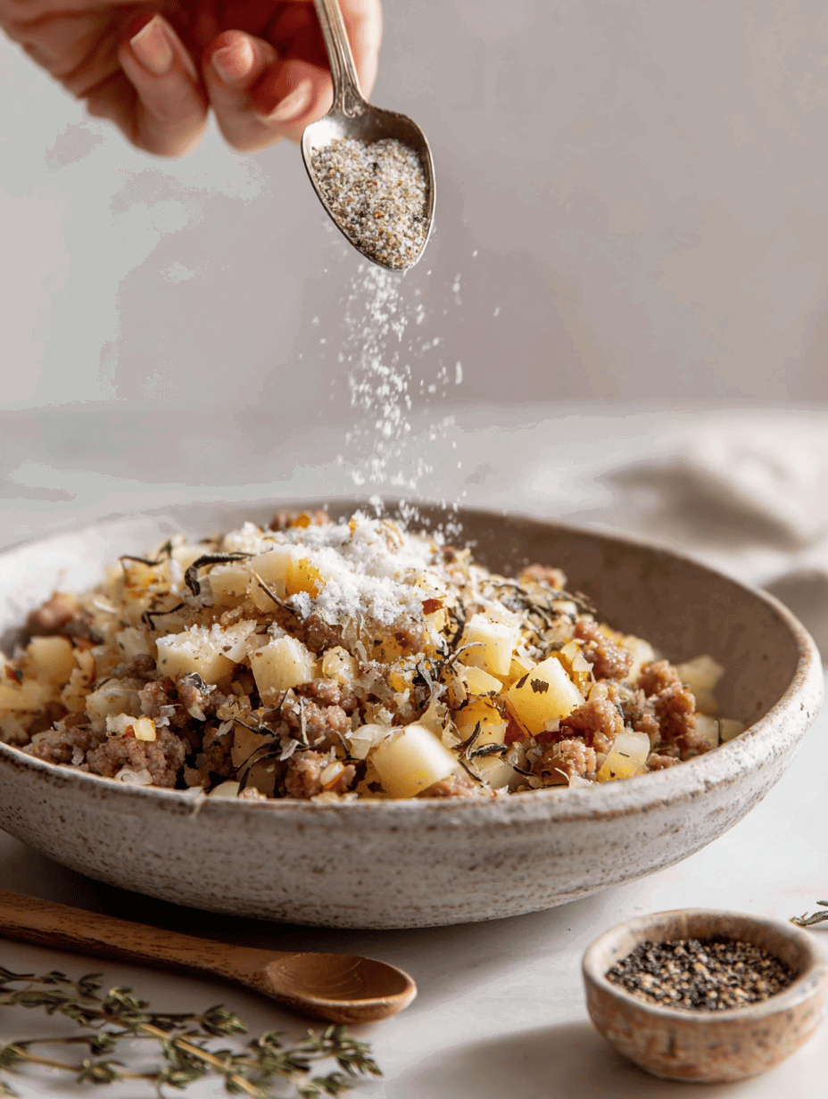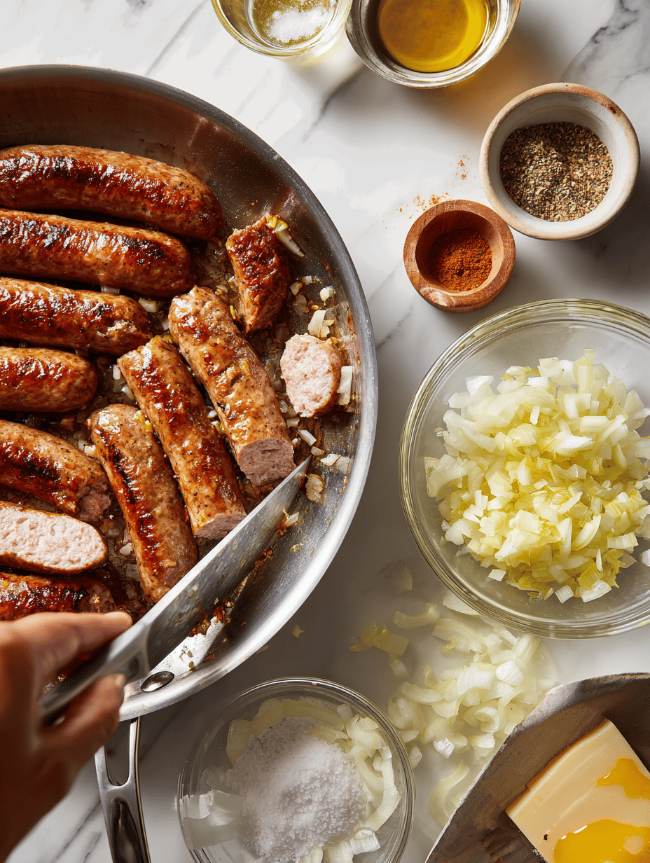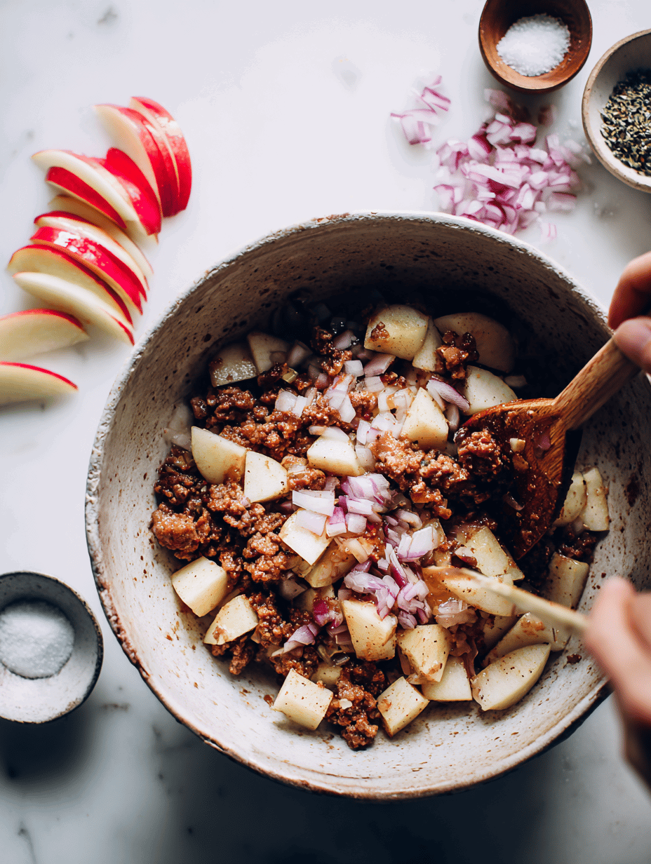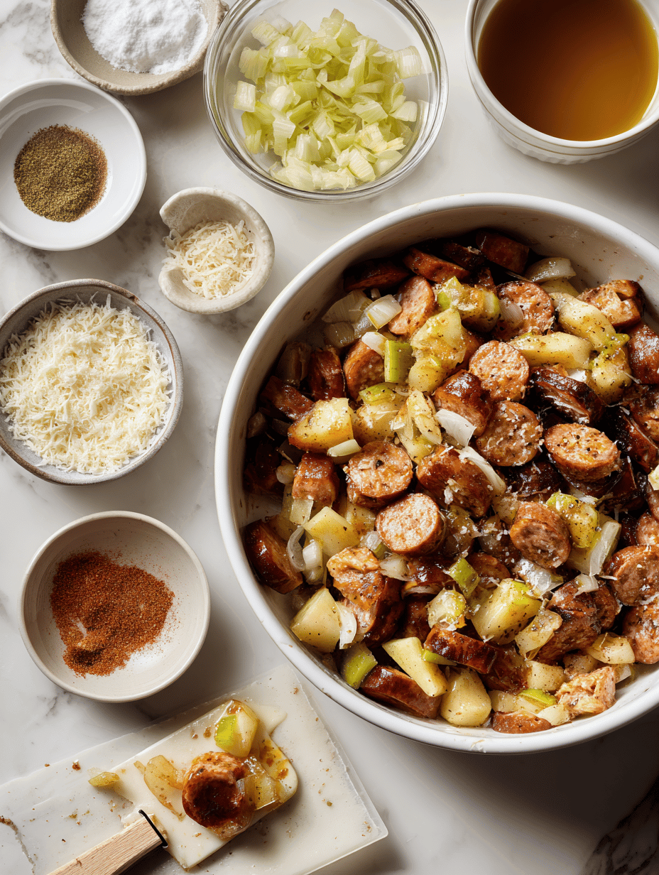 To start, preheat your oven to 375°F (190°C). In a large skillet, cook your sausage until browned and cooked through. If you’re using links, slice them into bite-sized pieces before browning; if you’re using bulk sausage, simply crumble it as it cooks. Once cooked, transfer the sausage to a mixing bowl. While the sausage is still warm, add sliced apples—thinly sliced to ensure even cooking—and a handful of chopped onions if desired, for added depth of flavor. Season the mixture generously with salt, pepper, and a sprinkle of sage or thyme, herbs that evoke warm autumnal aromas.