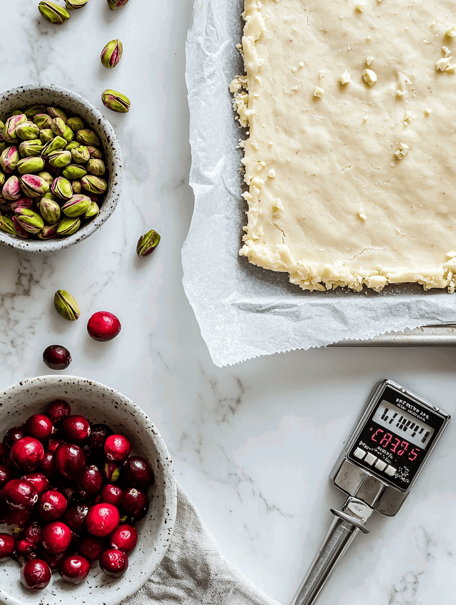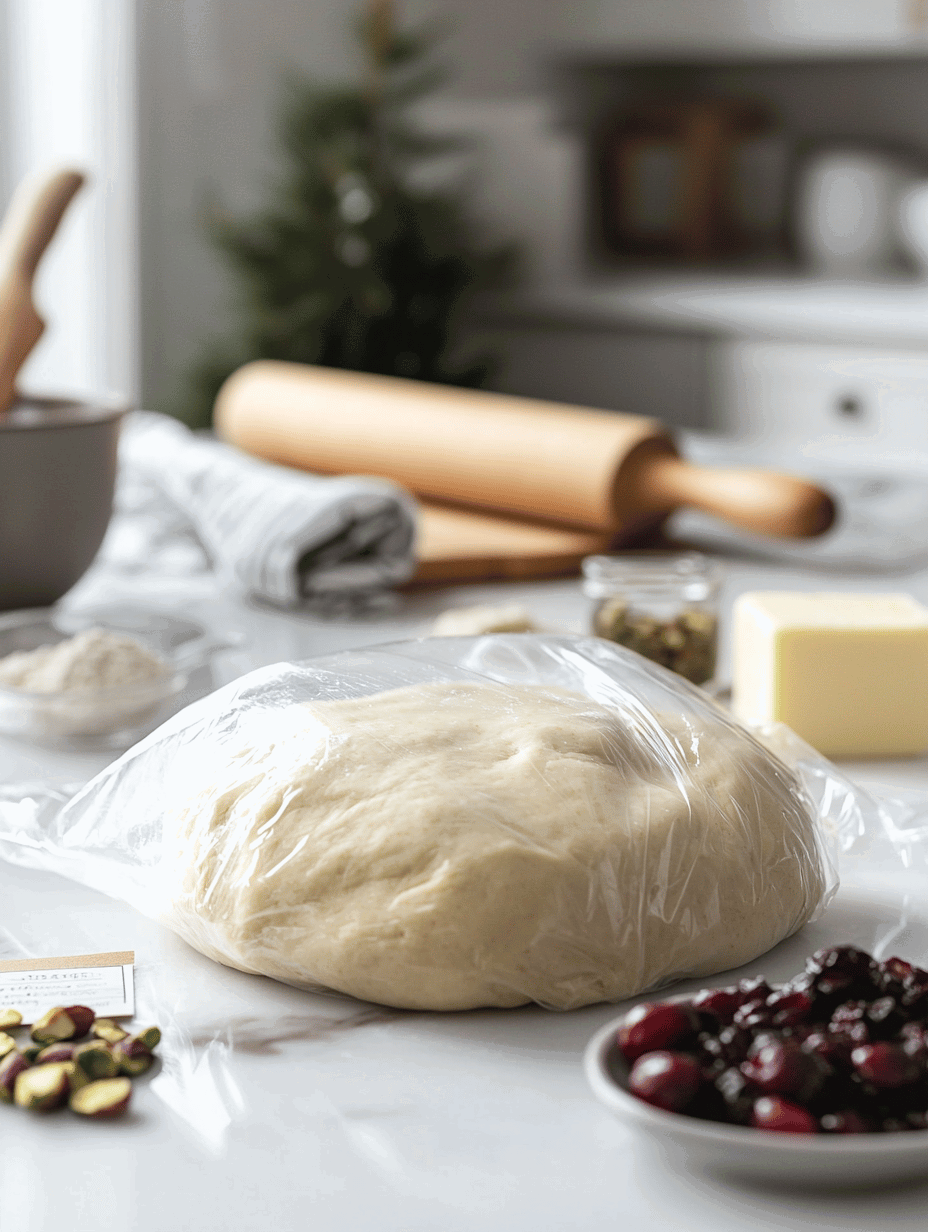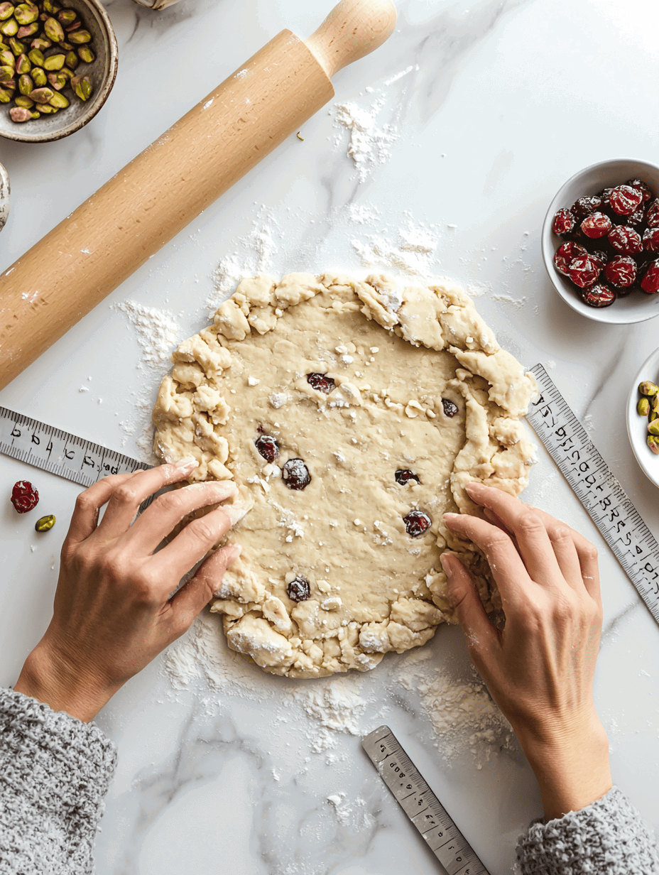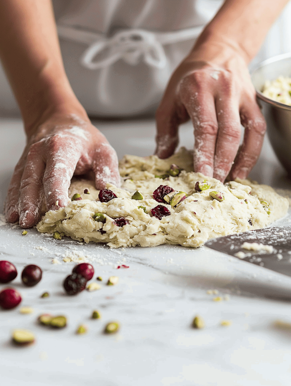 - Gently fold in the chopped cranberries and pistachios, distributing them evenly throughout the dough.
