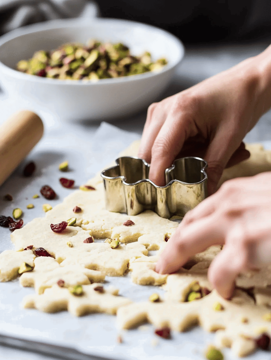 - Cut out cookies using a cookie cutter or a knife into desired shapes, then transfer them onto the prepared baking sheet.