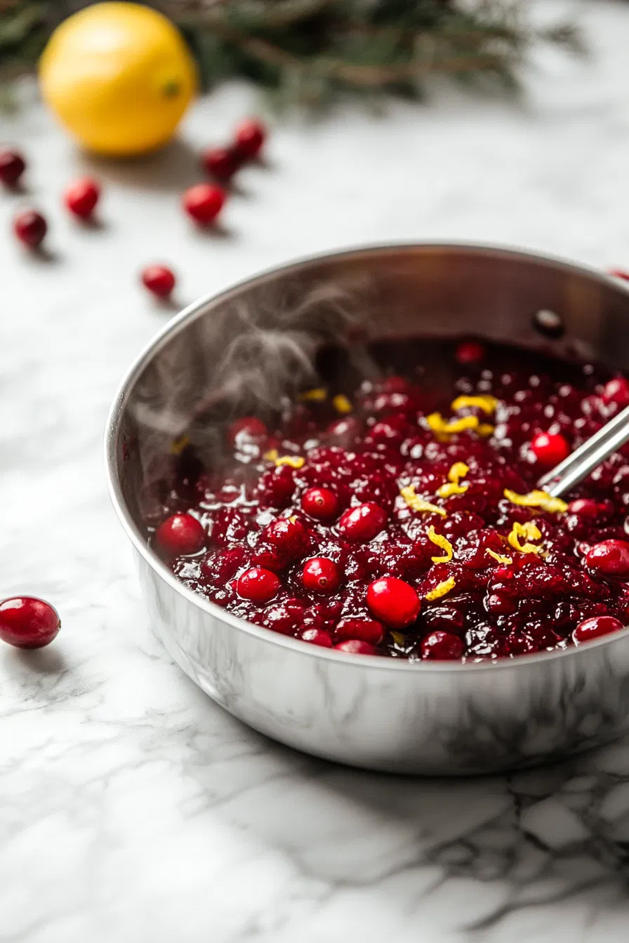 • Add the cranberries to the syrup and stir gently. Increase the heat slightly and let the mixture simmer, bubbling softly, for about 10 minutes, until the berries burst and release their juices, turning the sauce a vibrant red.