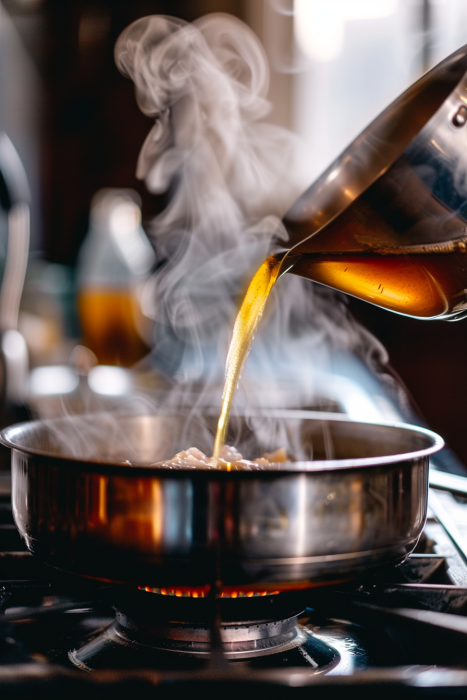 - Broth pours in, pale and thin at first, until the cream folds through and everything turns gold.