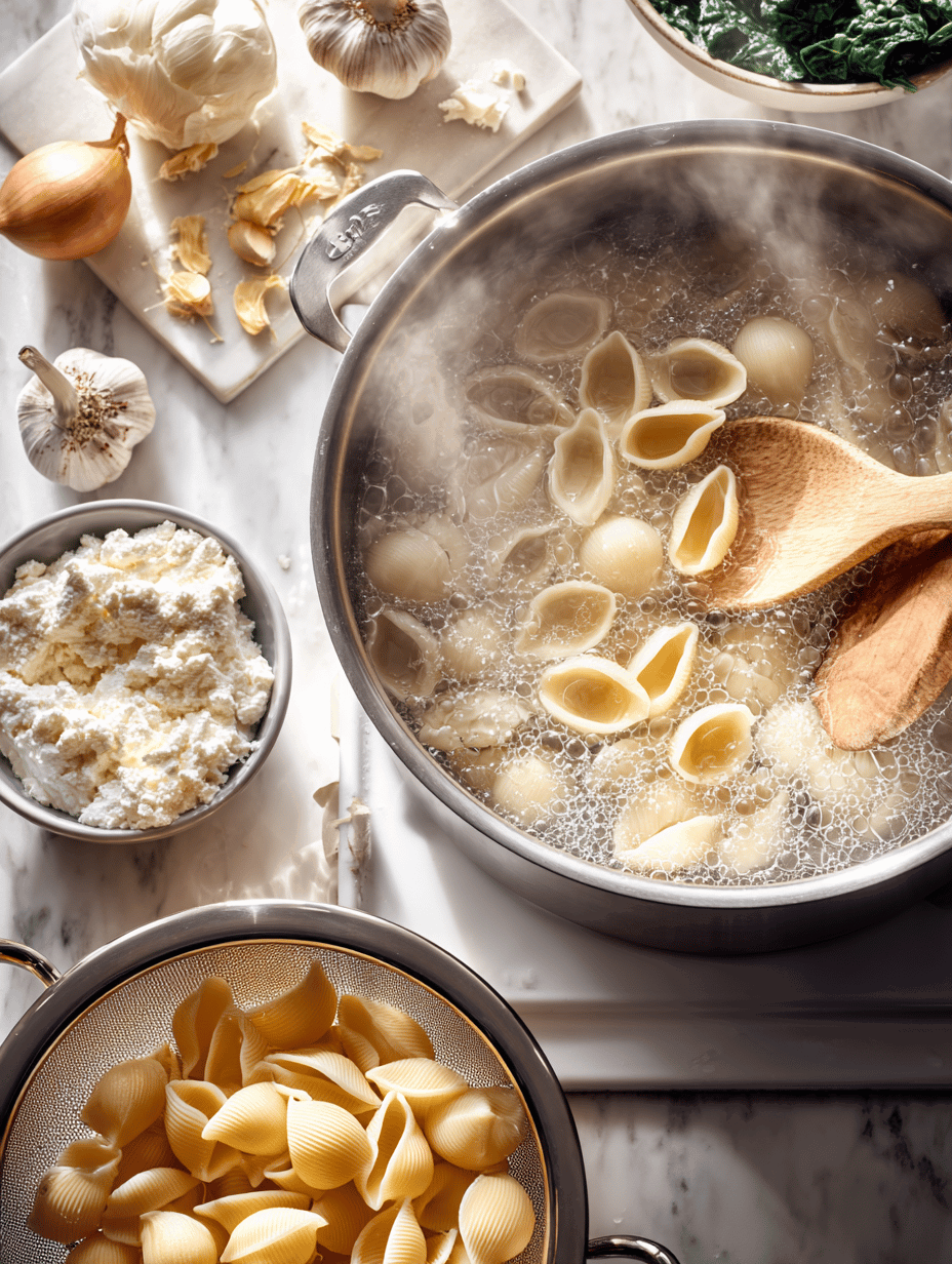 - Preheat your oven to 190°C (375°F). Bring a large pot of salted water to a boil and cook the shells until just al dente, about 10 minutes. Drain and set aside, letting them cool slightly.