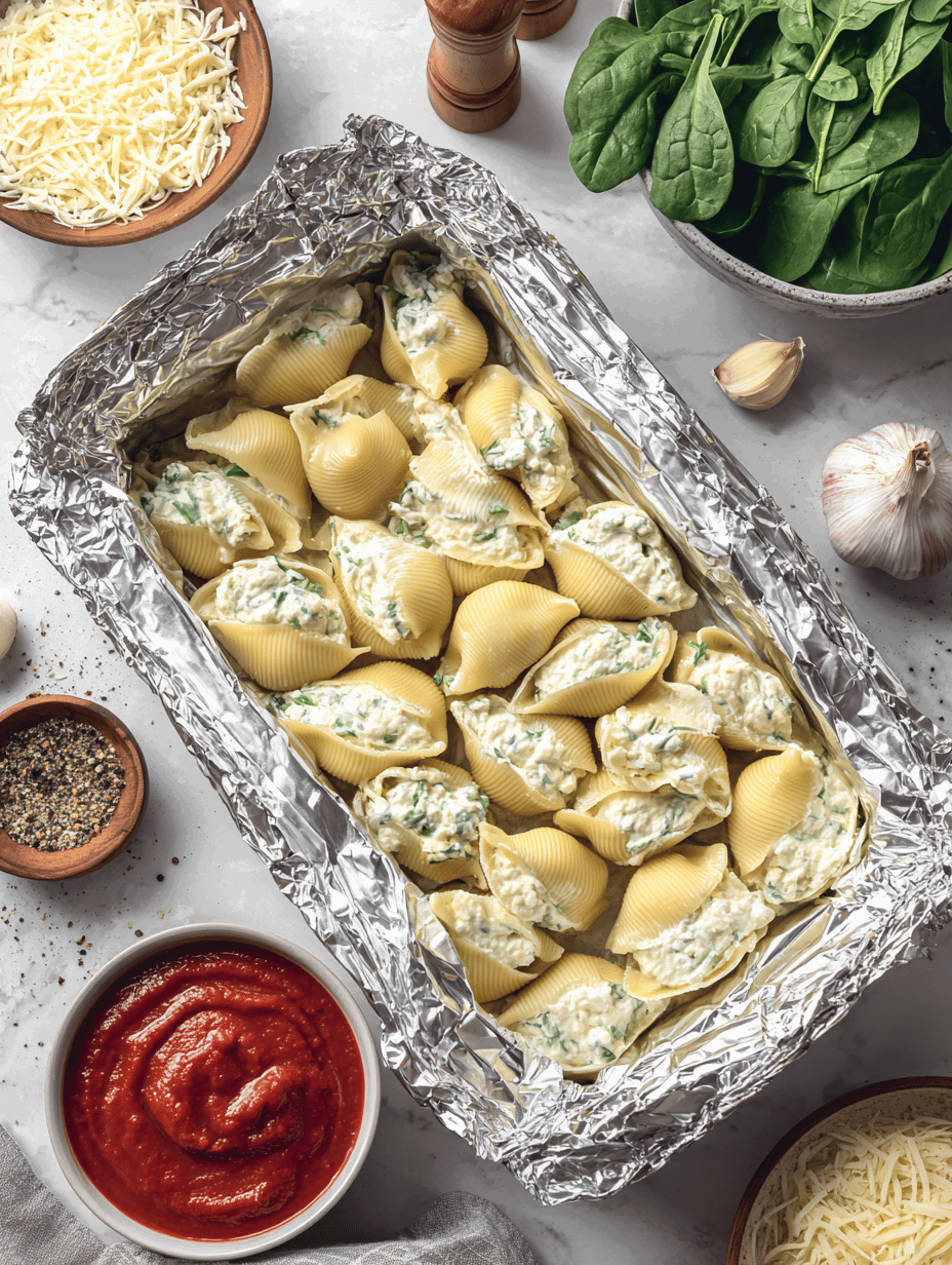 - Using a spoon or piping bag, generously stuff each cooked shell with the cheesy spinach mixture, pressing gently to fill the hollow center. Arrange the filled shells in a baking dish in a single layer.