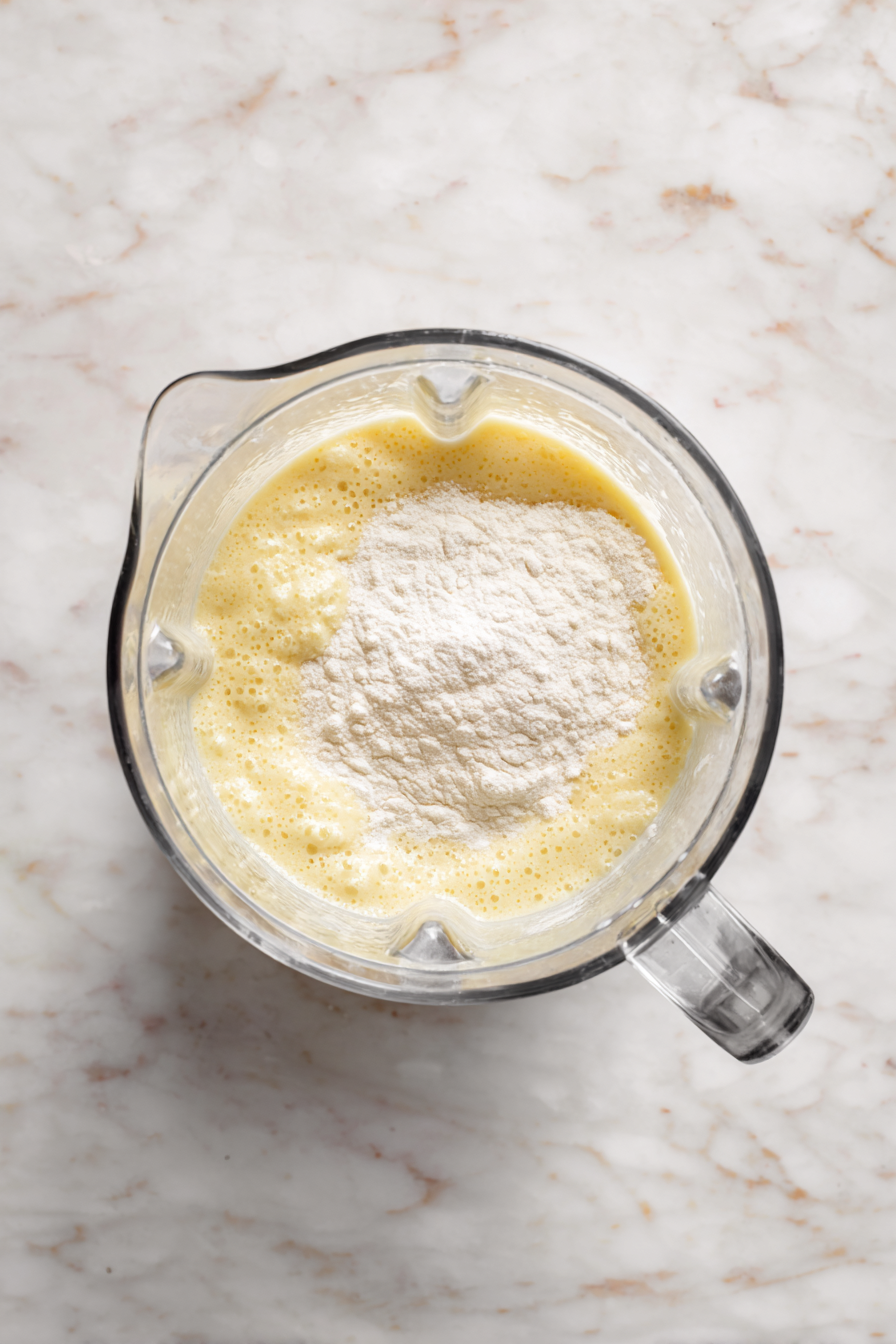 - Blend cooled butter with flour, sugar, salt, milk, water, eggs, and vanilla until smooth.