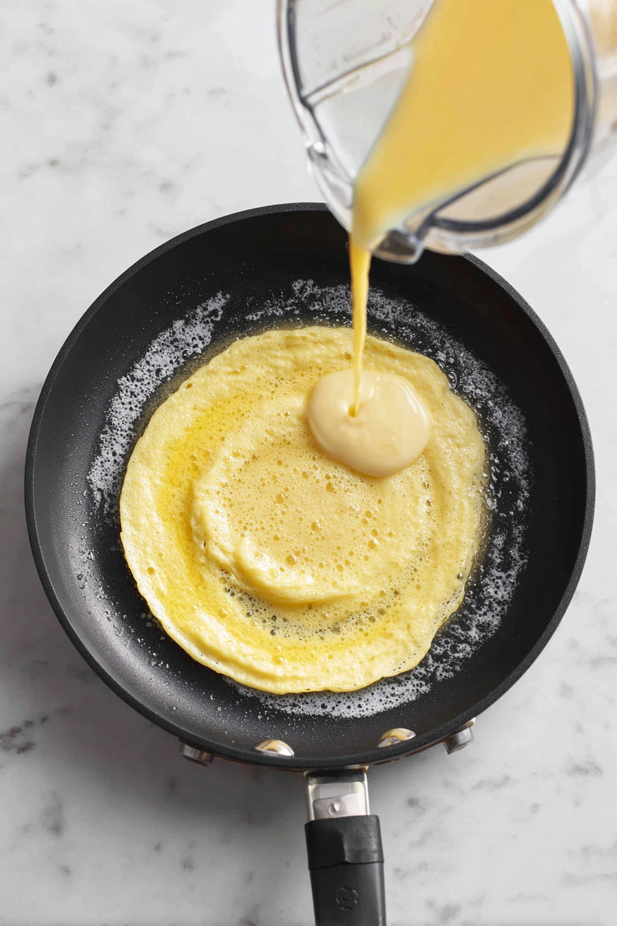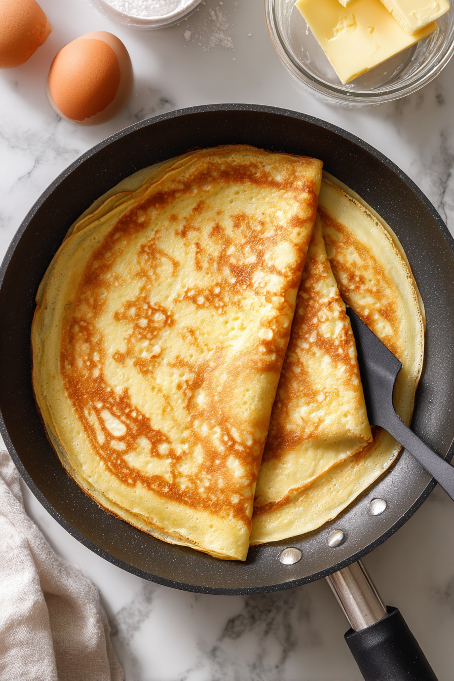 - Grease skillet with reserved butter, pour in batter, cook until set (1–2 mins per side).