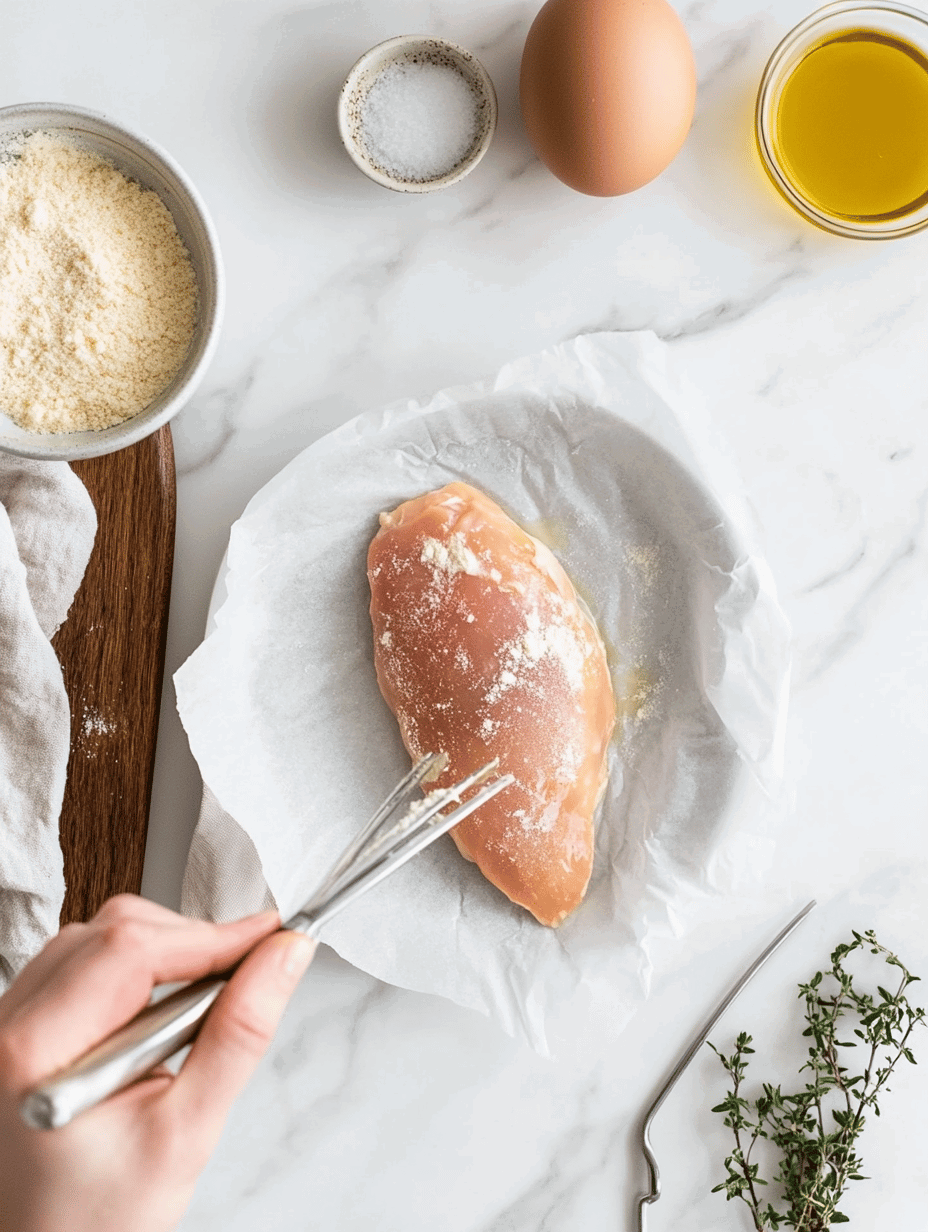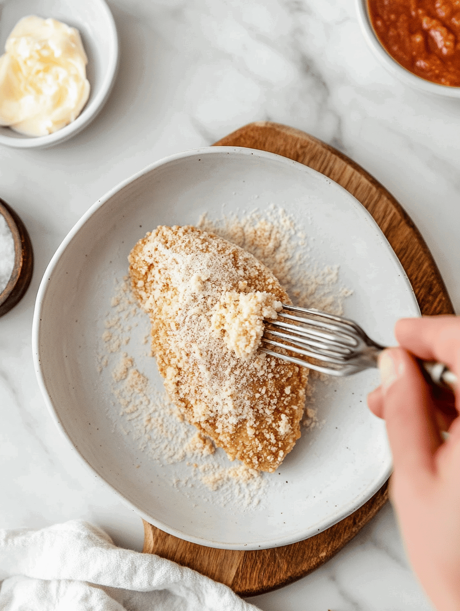 • Dredge the chicken in almond flour, coating both sides until evenly coated.