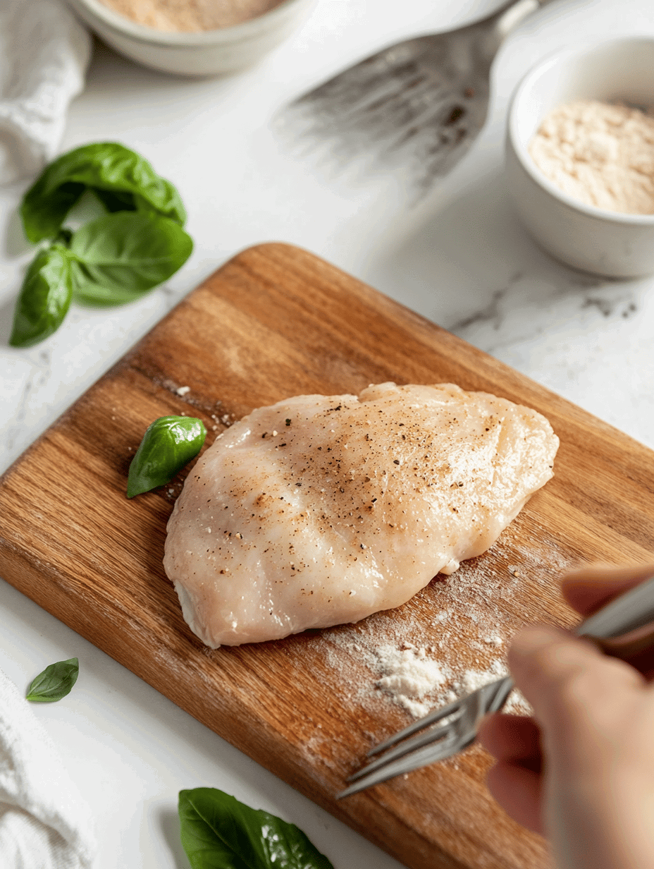 • Pound the chicken breasts to an even thickness, about ½ inch thick.