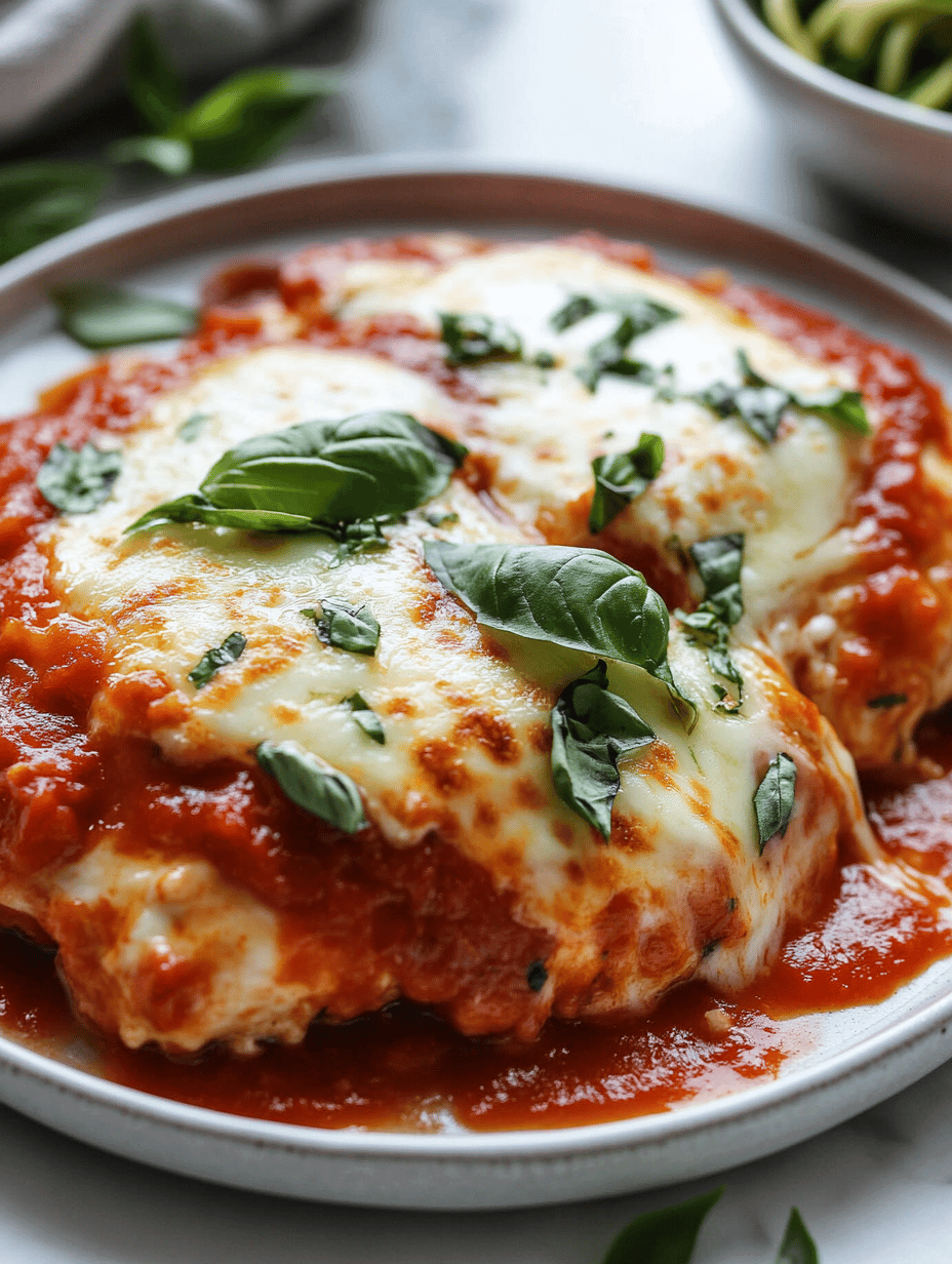 A crispy on the outside, juicy on the inside chicken dish, coated with an almond flour crust, adorned with marinara sauce and melted mozzarella cheese, all while staying low-carb.