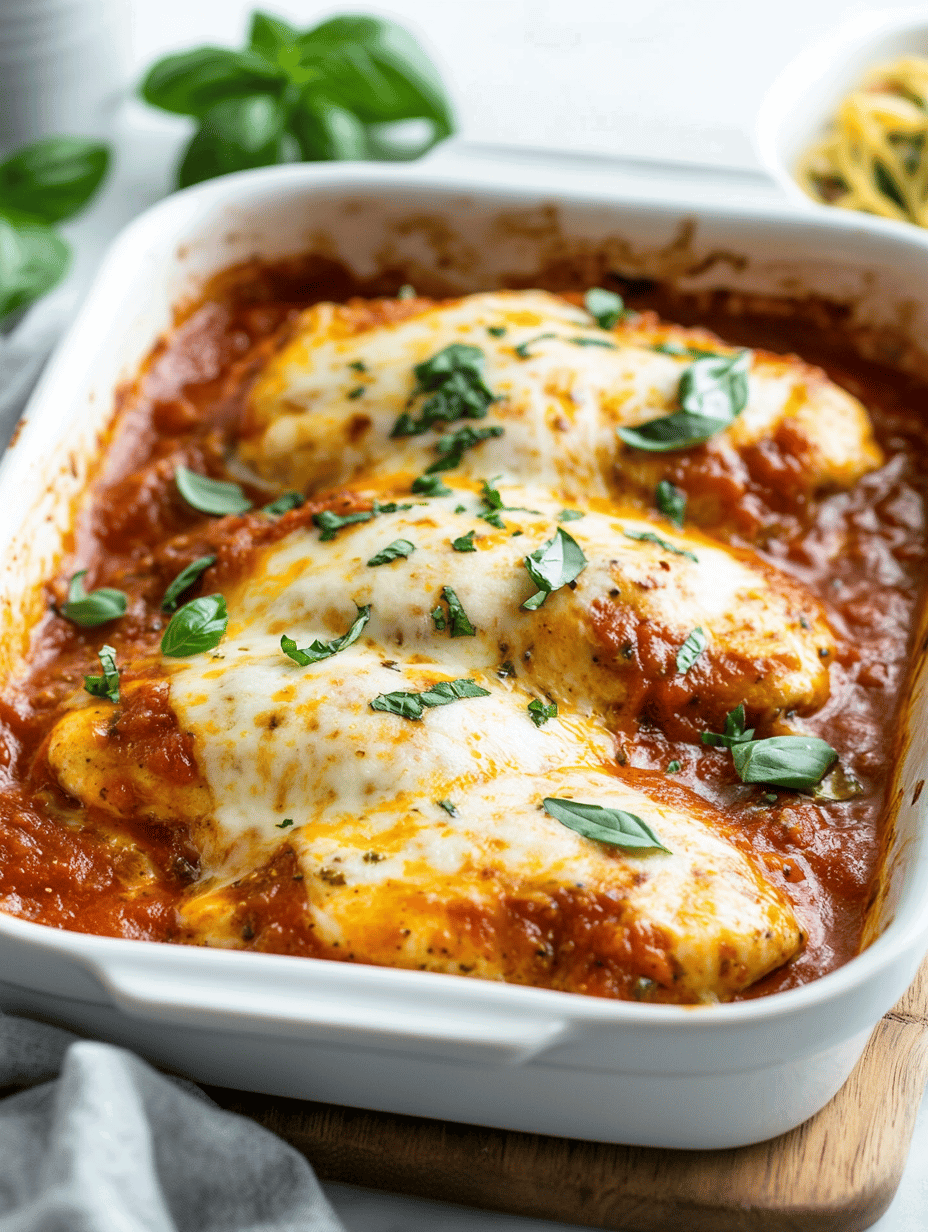 • Pour marinara sauce over the chicken and sprinkle with mozzarella cheese.