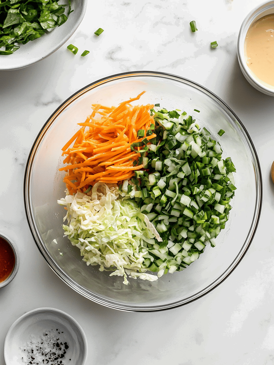2 cups cabbage, shredded, 1 cup carrot, grated, 1 cup green onion, chopped