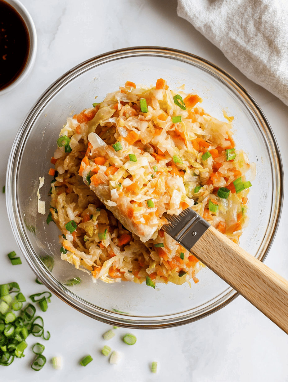 2 cups cabbage, shredded, 1 cup carrot, grated, 1 cup green onion, chopped, 1 tablespoon soy sauce