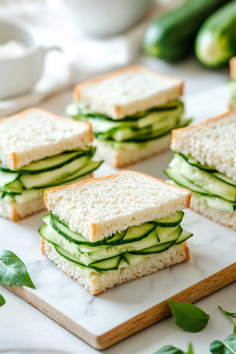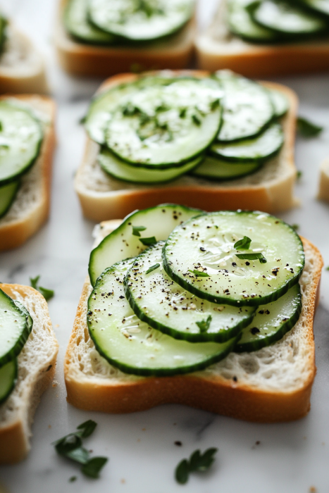 There’s something soothing about the coolness, the quiet layering, the soft press of bread and cucumber coming together.