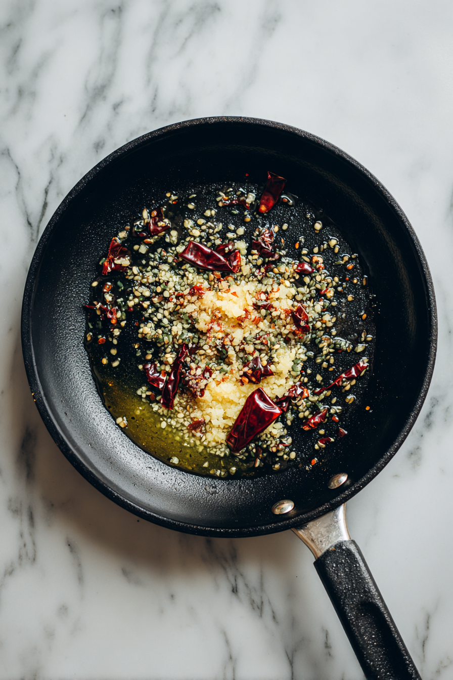 - Add cumin seeds, garlic, dry red chilies, hing, and chili powder. Sauté until aromatic.
