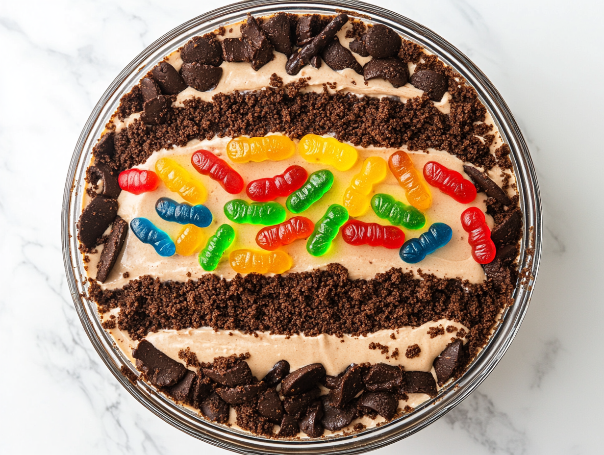 • Decorate with Gummy Worms: If desired, decorate the top of the Dirt Cake with gummy worms to give it a fun and playful appearance.