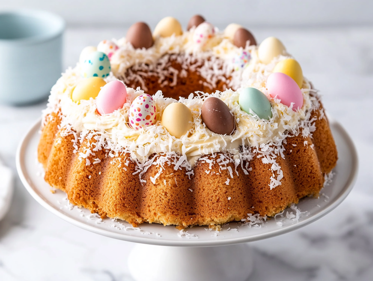 A lemon coconut Bundt cake, a symphony of flavors topped with a creamy lemon cream cheese frosting, sweetened coconut, and playful candy-coated chocolate eggs.