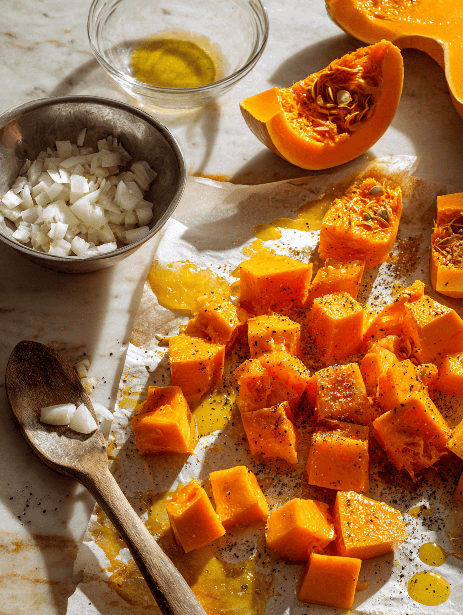- Cut your pumpkin or squash into rough chunks—don’t stress about perfect pieces. Toss with a generous splash of olive oil, salt, and pepper.