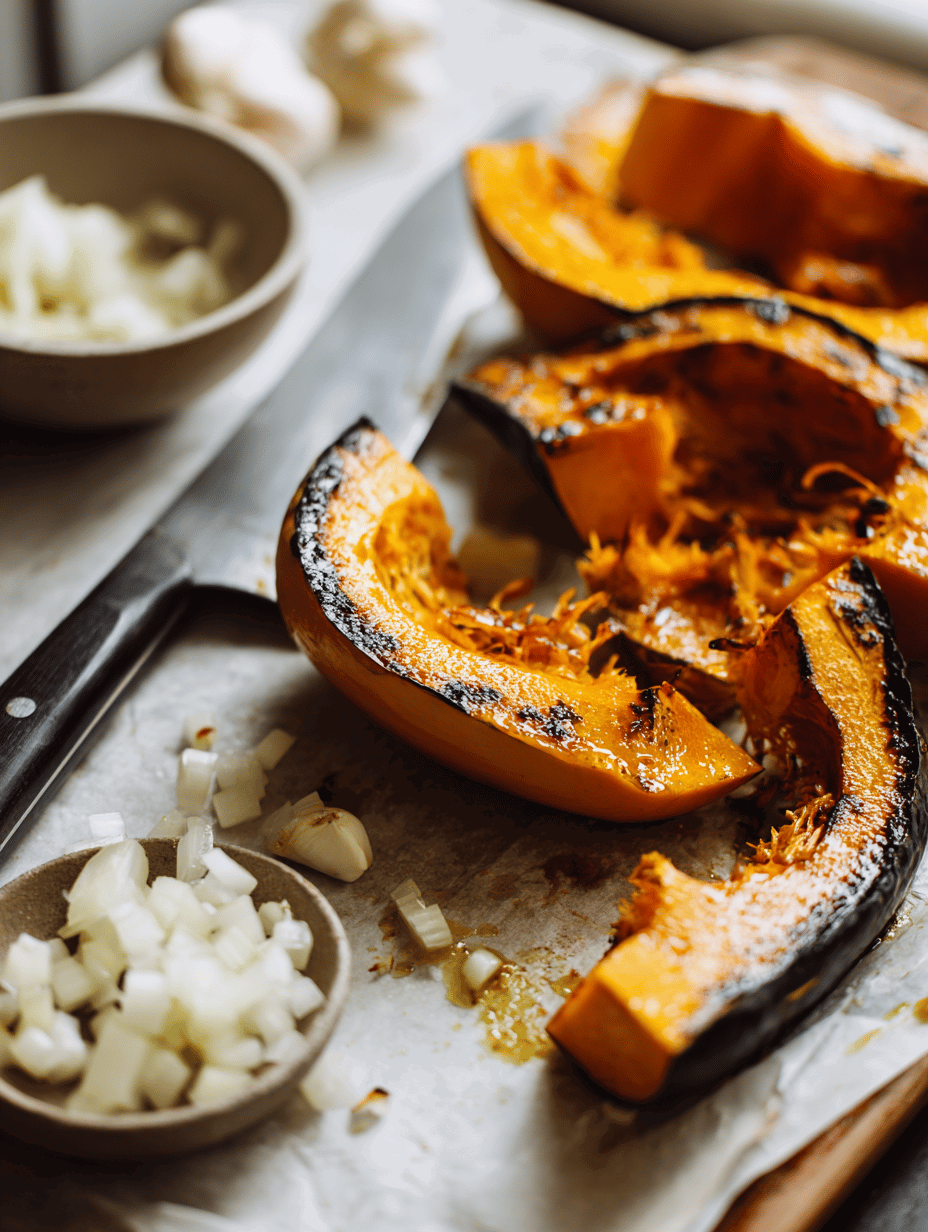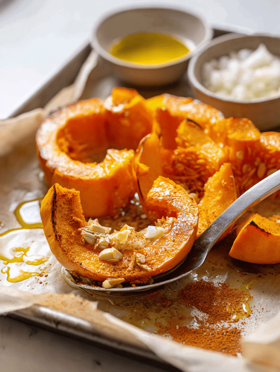 - Roast the pumpkin for 35–40 minutes, or until the edges are caramelized and the flesh is very tender. You’ll smell sweet and smoky aromas filling your kitchen as the pumpkin cooks.