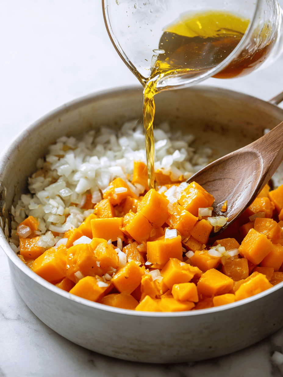 - Pour in vegetable stock—enough to cover the pumpkin, about 3–4 cups. Bring to a gentle simmer, cook for 10 minutes to meld flavors.