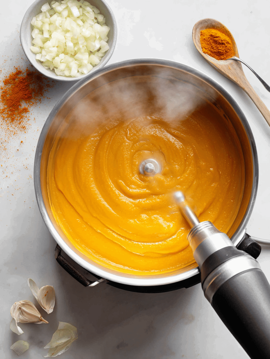 - Use an immersion blender (or transfer to a stand blender in batches) to purée until silky. Taste and adjust seasoning—more salt, pepper, or a squeeze of lemon if needed.