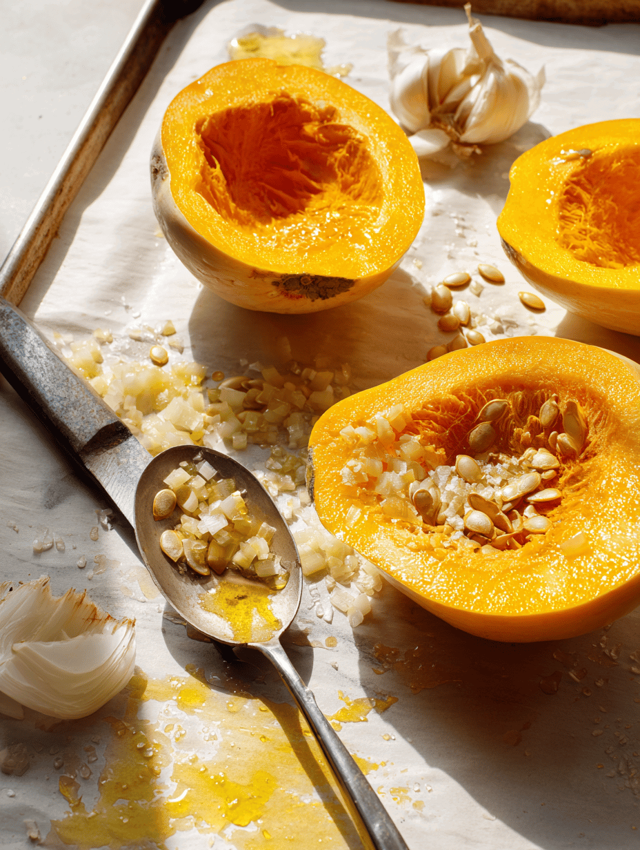 • Drizzle the pumpkin halves with olive oil and sprinkle with a pinch of salt. Roast for about 45-50 minutes until the flesh is soft and caramelized around the edges, filling your kitchen with a sweet, roasted aroma.