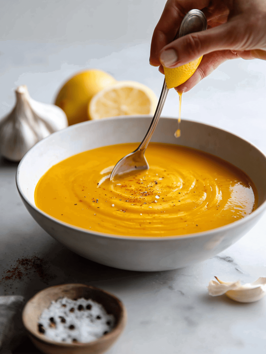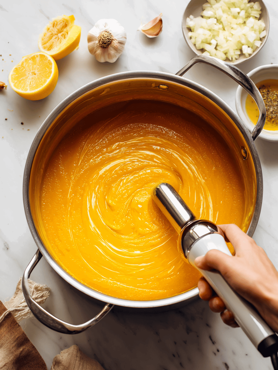 • Use an immersion blender directly in the pot or transfer the soup to a blender in batches. Puree until silky smooth, feeling the soup become thick and velvety.