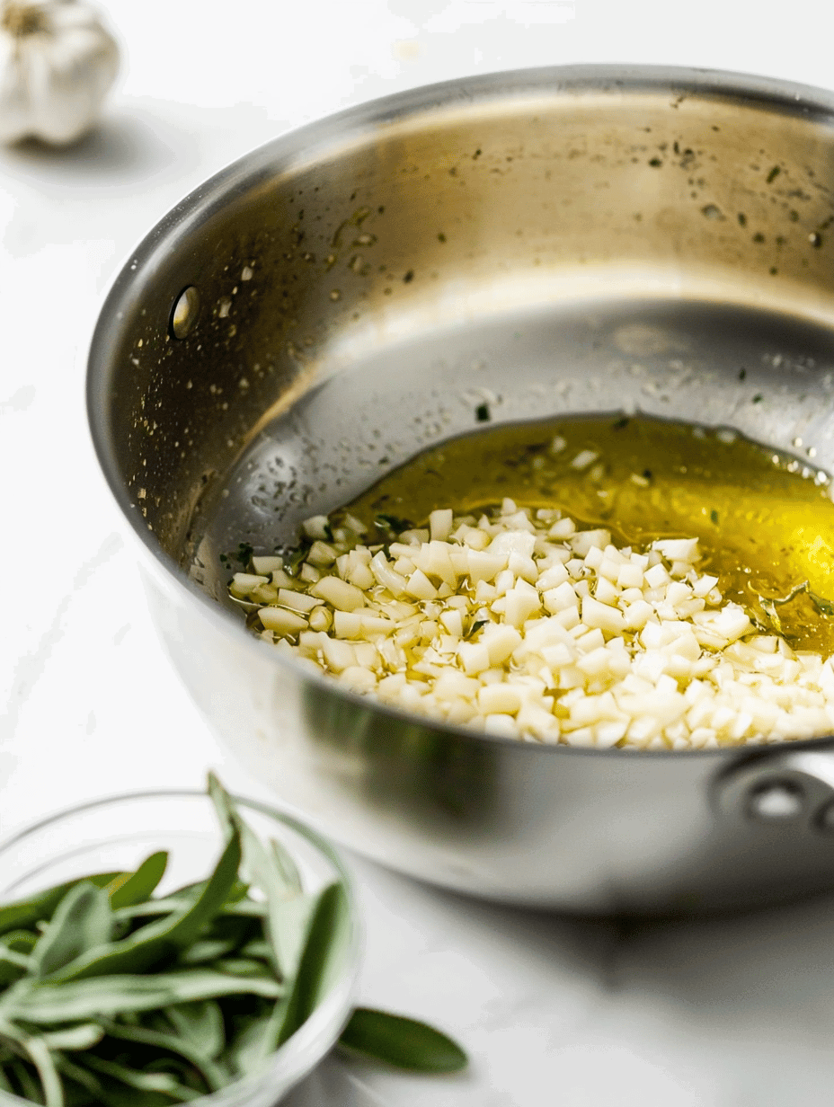 - Meanwhile, heat a large pot over medium heat. Add a splash of oil and sauté the minced garlic with chopped sage until fragrant, about 1 minute, until the garlic turns golden.