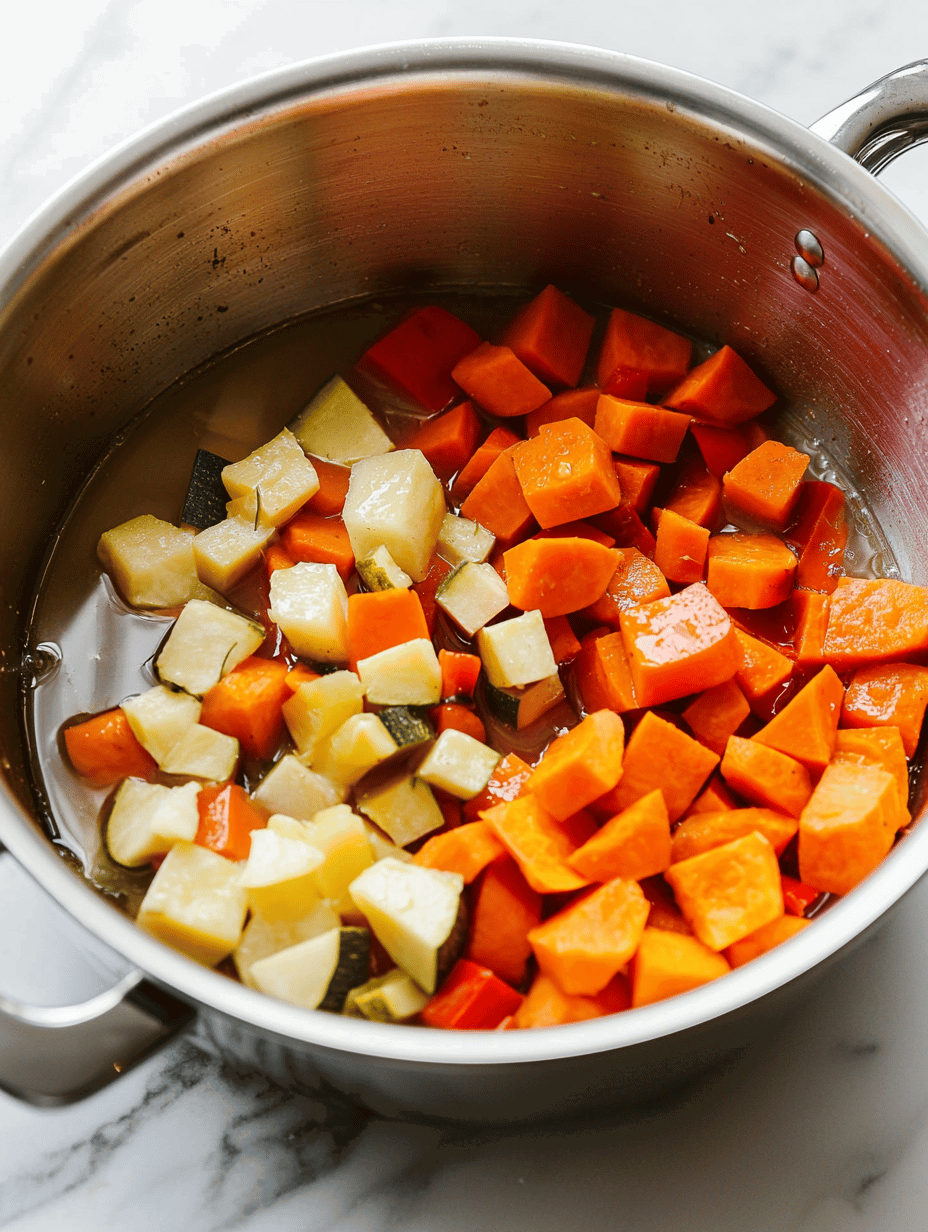 - Add the roasted vegetables to the pot and pour in the vegetable broth. Bring the mixture to a gentle simmer and cook for 10 minutes to let the flavors meld.