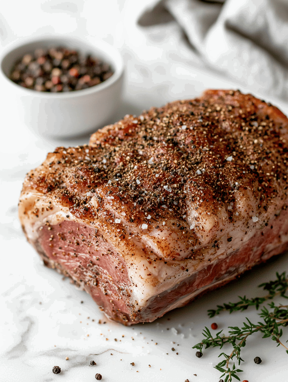 - Season the pork roast generously with salt, pepper, cinnamon, and nutmeg, then set aside.