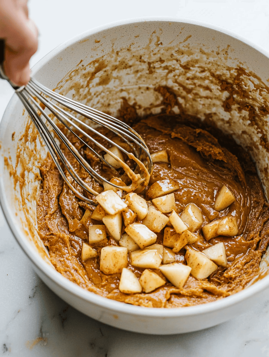 - Gently fold in the sautéed apple slices to evenly distribute caramelized bits throughout the batter.