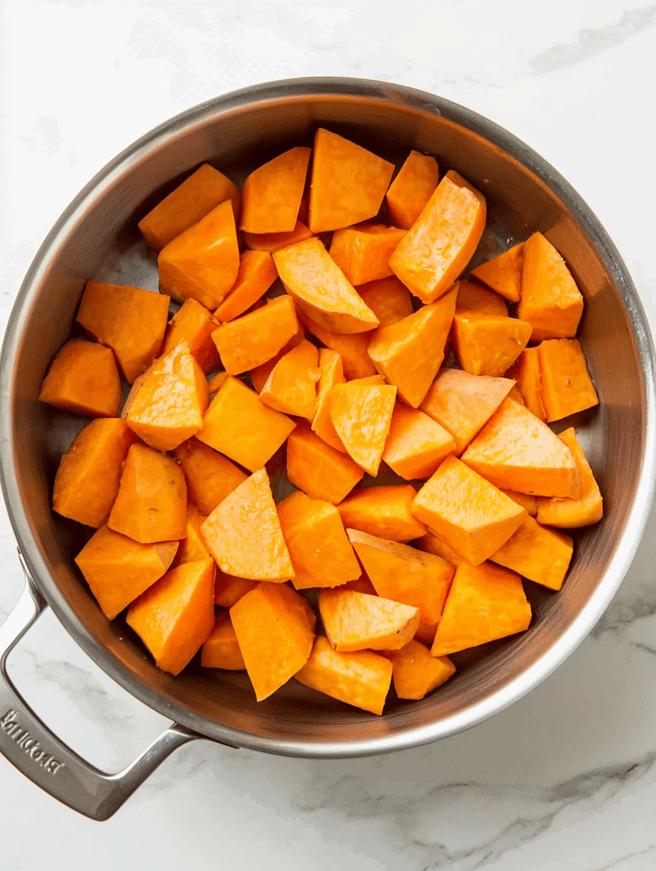 - Heat olive oil in a large pot over medium heat. Add the chopped sweet potatoes and cook, stirring occasionally, until they start to soften and develop some color, about 8 minutes. The sweet potatoes should be slightly browned and fragrant.